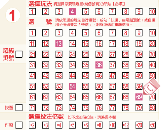 *1星」玩法代表您只必須填選一個號碼,作為您的選號;「2星」玩法代表您必須填選二個號碼,作